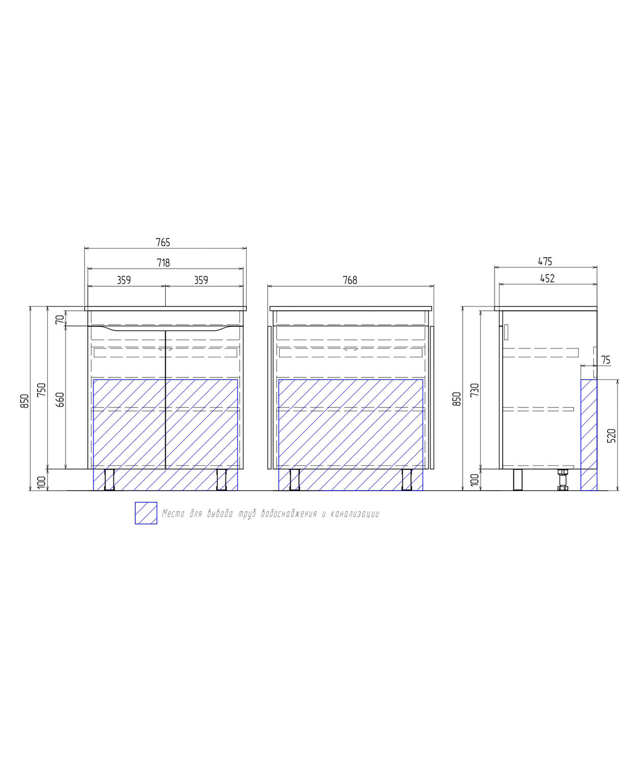 Тумба с раковиной напольная VIGO Grani tn.GRI.OSK.75.2D, 75 см. Раковина в комплекте. 2 дверцы, 1 ящик; органайзер для мелочей, опоры квадратные регулируемые варианты размещения: напольное.