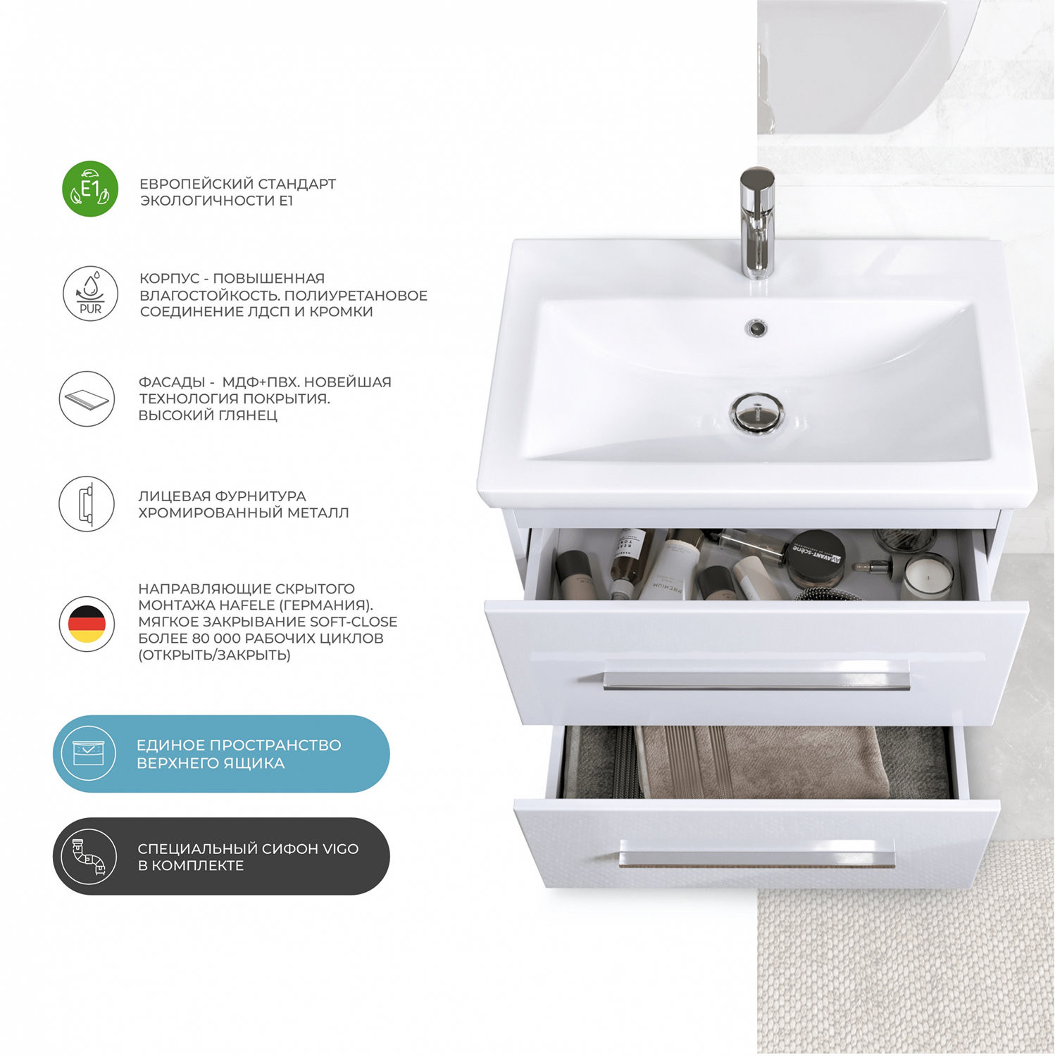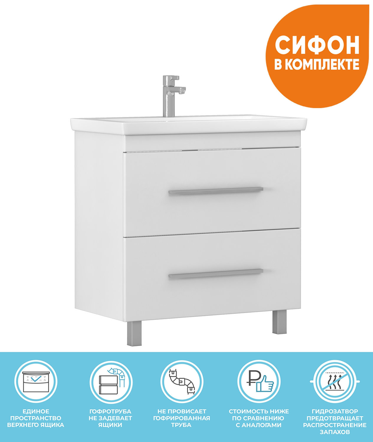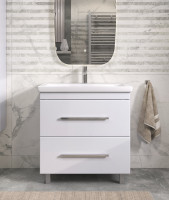 Тумба с раковиной напольная VIGO Land tn.LAN.COM.80.2Y, 80 см. Раковина в комплекте. 2 выдвижных ящика, скрытые направляющие Hafele, 2 навеса, 2 опоры квадратные регулируемые, 1 сифон..