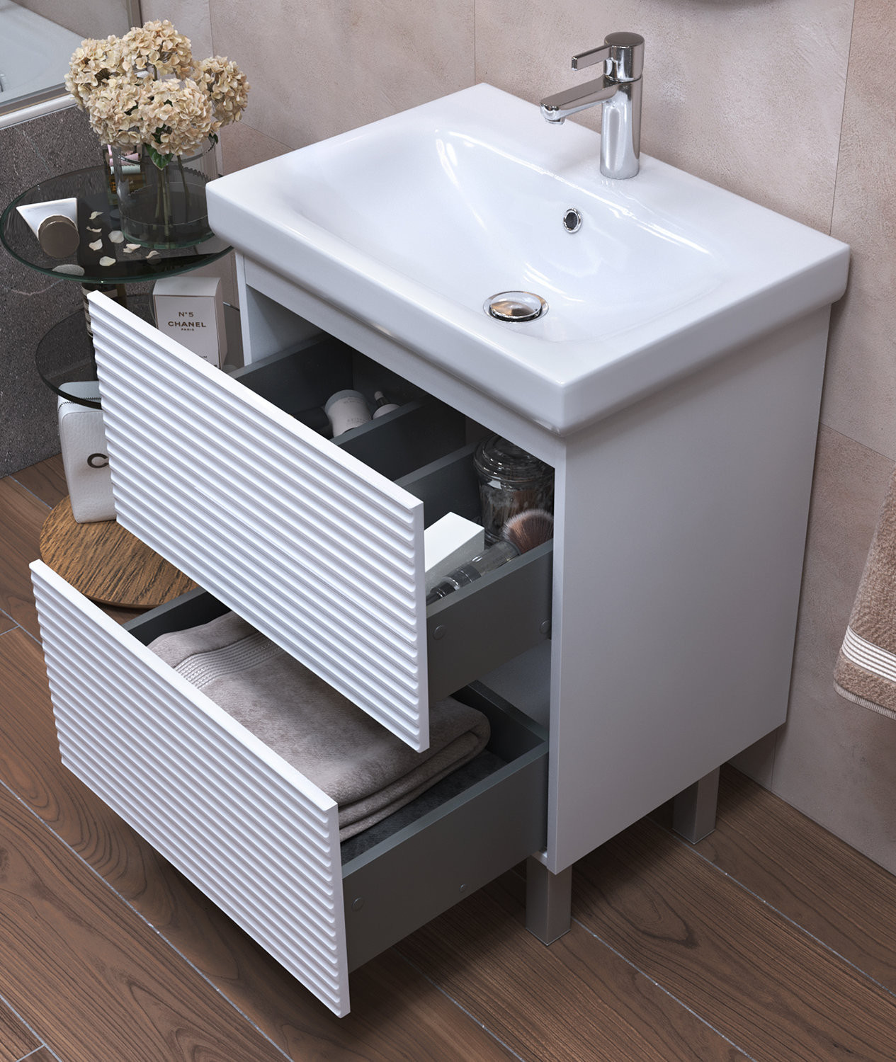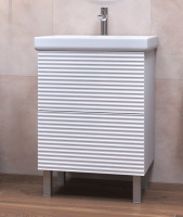Тумба с раковиной напольная VIGO Otti tn.OTT.MOD.60.2Y, 60 см. Раковина в комплекте. Тумбы Otti выделяются оригинальным исполнением фасадов, благодаря горизонтальной фрезеровке. Встроенный механизм push-to-open Hafele (Германия).Удобное открывание легким нажатием на фасад Два варианта размещения: напольное/подвесное.