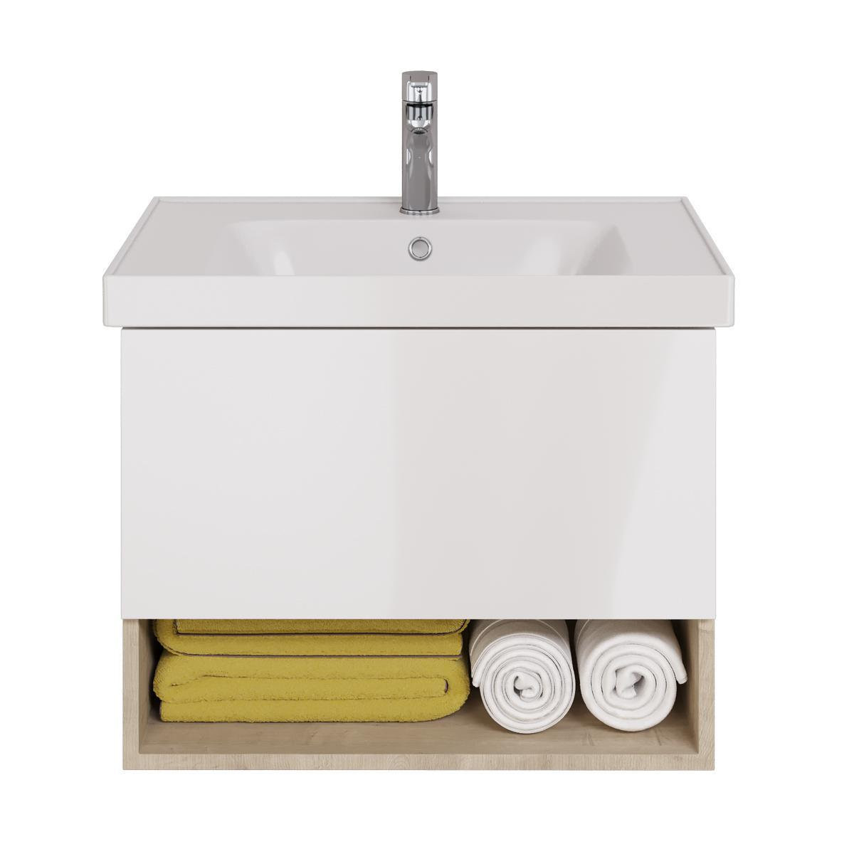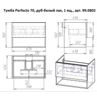 Тумба под раковину подвесная Dreja Perfecto 70 см, дуб эврика/белый. Фурнитура: Hettich. Компоновка: 1 ящик. Дополнительные функции: встроенный органайзер. Монтаж: подвесной. Раковина арт.: 641600 в комплекте.