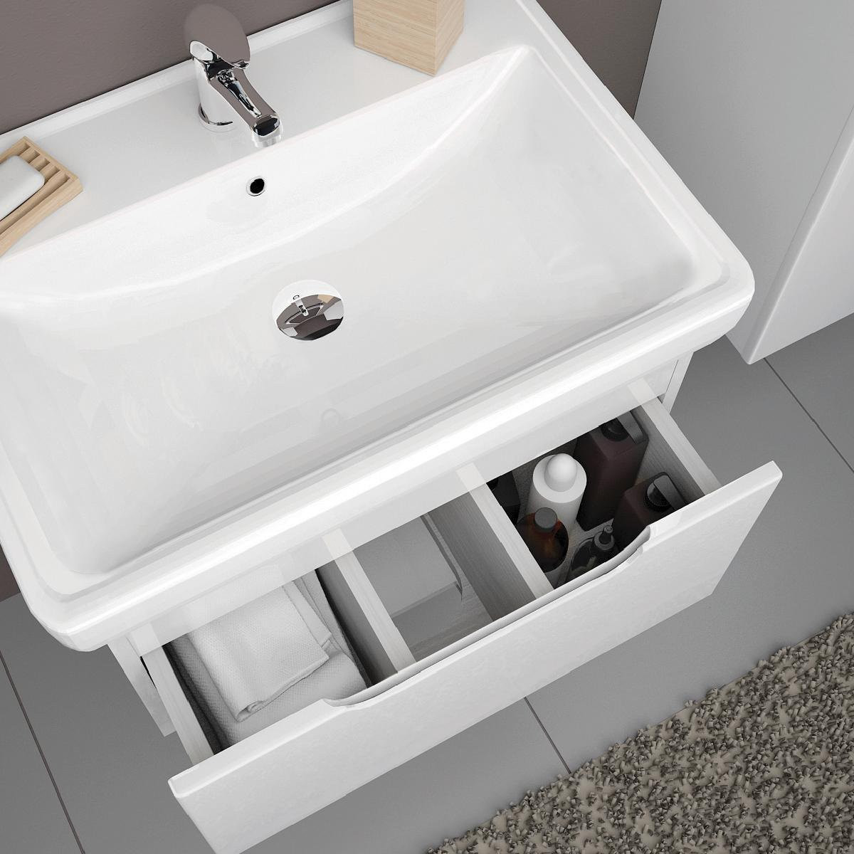 Тумба под раковину подвесная Dreja Tiny 50 см, белый. Фурнитура: Hettich. Компоновка: 1 ящик. Дополнительные функции: встроенный органайзер. Монтаж: подвесной. Раковина арт.: 195032 в комплекте.