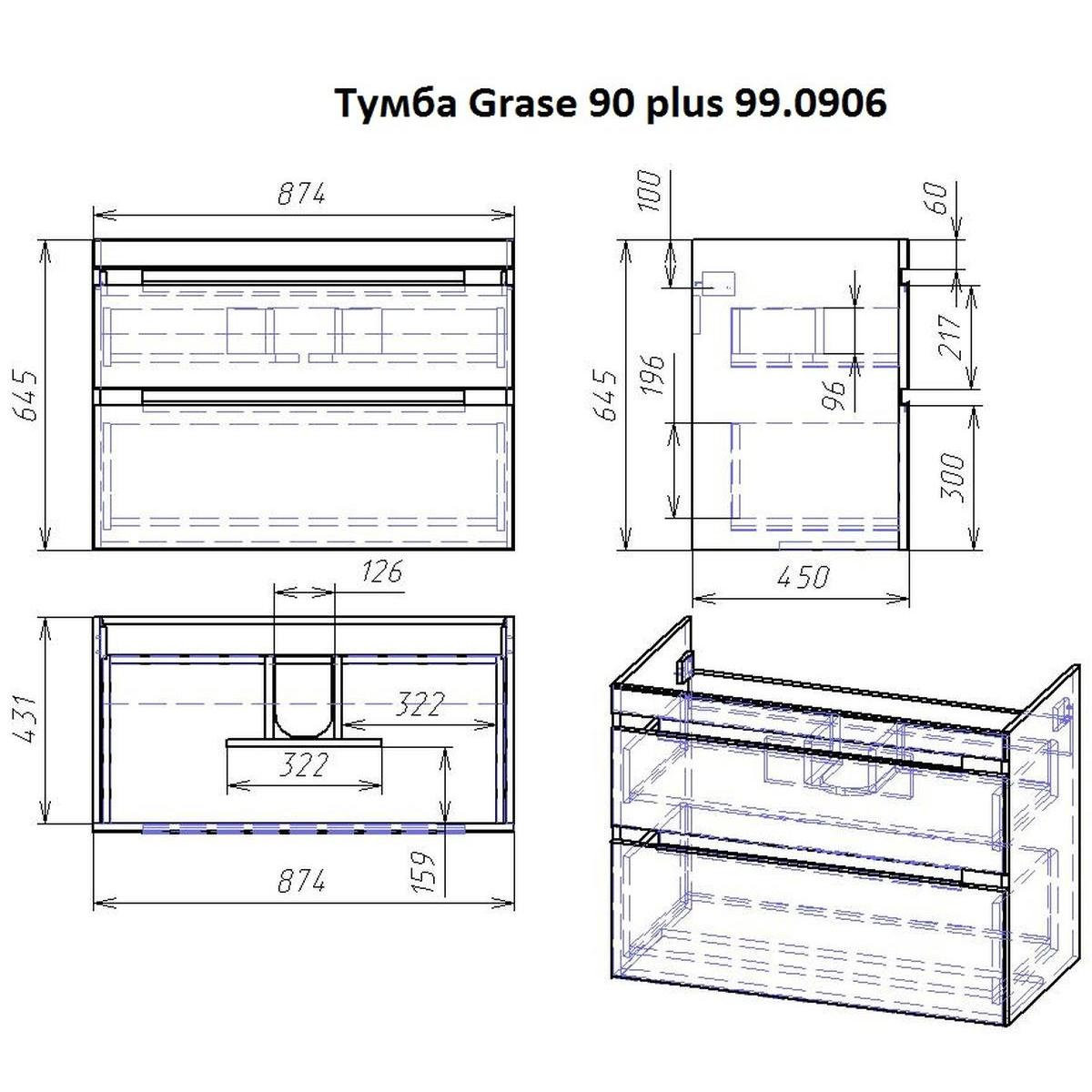Тумба под раковину подвесная/напольная Dreja Grace Plus 90 см, белый. Фурнитура: Hettich. Компоновка: 2 ящика. Дополнительные функции: встроенный органайзер в верхнем ящике. Монтаж: подвесной/напольный. Для монтажа необходимо закрепить тумбу к стене и использовать входящие в комплект поставки опоры. Раковина арт.: 641617 в комплекте.