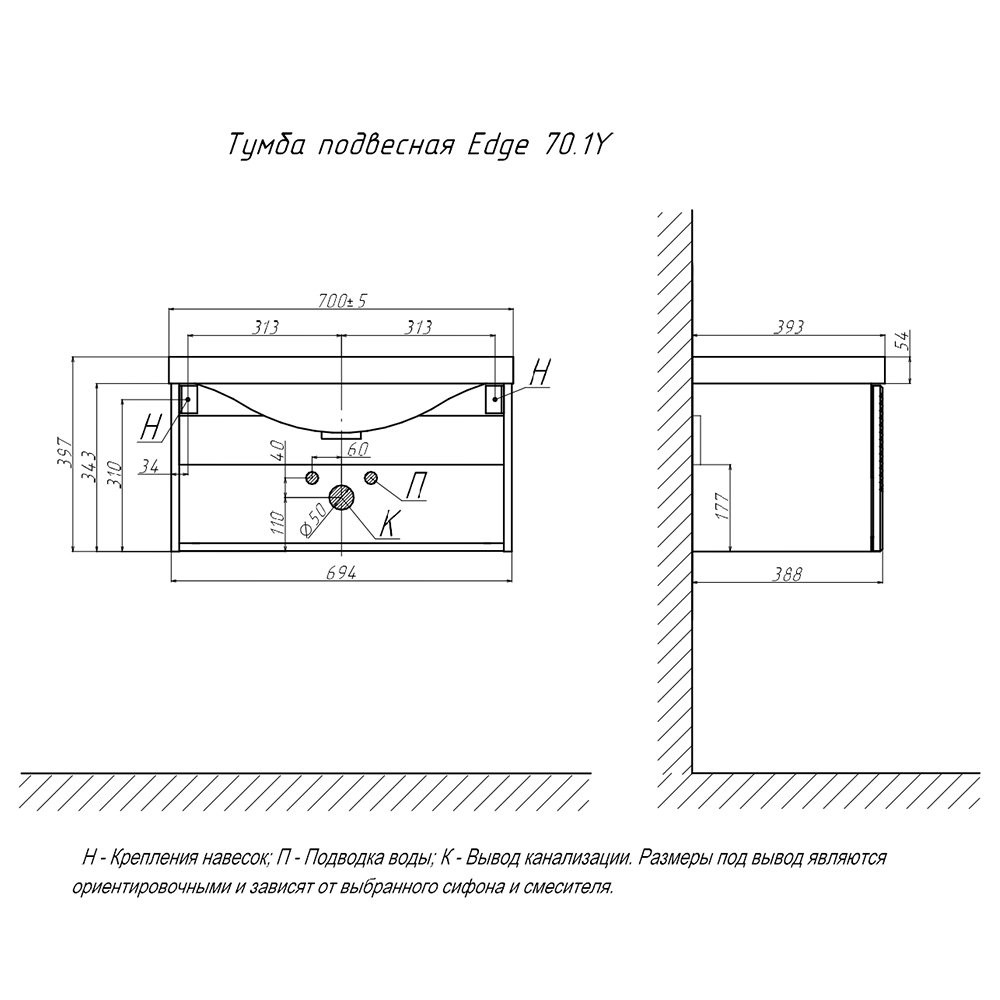 Тумба с раковиной подвесная Velvex Edge tp.EDG.9696.70.1Y графит, 70 см: 1 выдвижной ящик с механизмом открывания push-to-open. Раковина в комплекте.