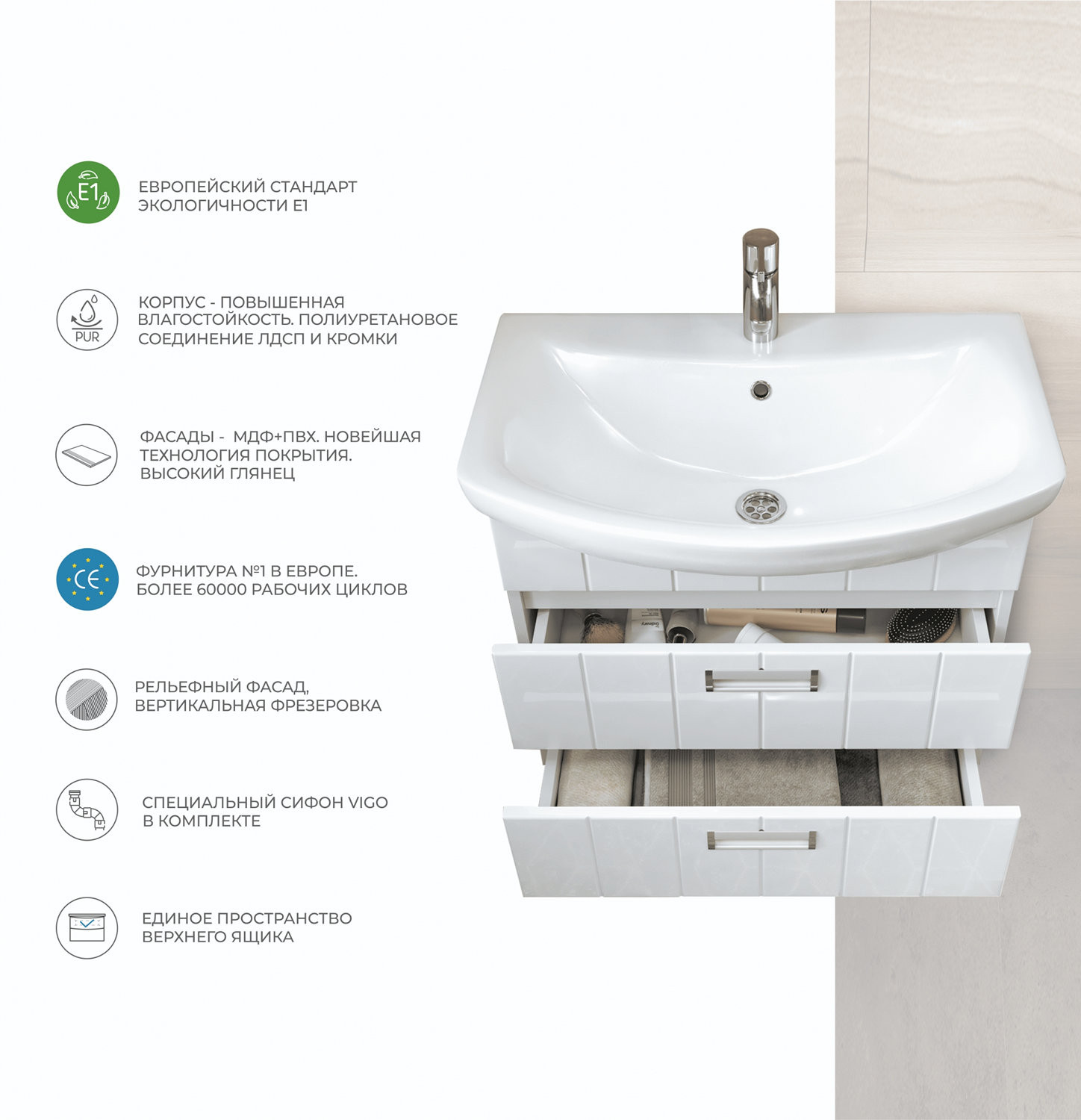 Тумба с раковиной подвесная VIGO Diana tp.DIA.PAL.60.2Y, 60 см. Раковина в комплекте. 2 выдвижных ящика; ручка врезная металлическая хромированная. Специальный сифон Vigo в комплекте. Материал корпуса: влагостойкая ЛДСП Материал фасадов: ЛМДФ Покрытие: пленка ПВХ Ящики: направляющие полного выдвижения..