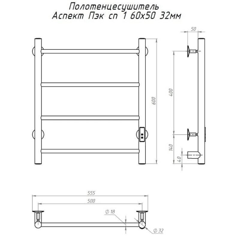 Полотенцесушитель Аспект Пэк сп 1 60х50 32 мм. Коллекция: Аспект Пэк сп серия 1. Тип: электрический. Форма: лесенка. Мощность (Вт): не более 100Вт. Количество перекладин: 4. Материал: нержавеющая сталь AISI 201. Подключение: скрытое электрическое соединение/электропровод с вилкой.