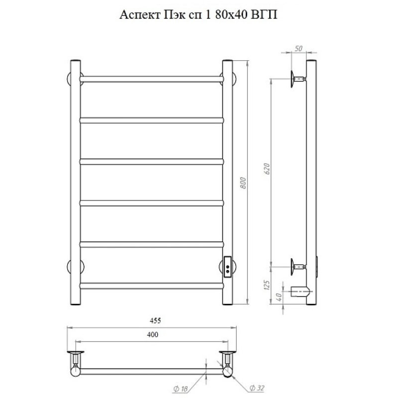 Полотенцесушитель Аспект Пэк сп 1 80х40 графит ВГП. Коллекция: Аспект Пэк сп 1 серия. Тип: электрический. Форма: лесенка. Мощность (Вт): не более 100Вт. Количество перекладин: 6. Материал: сталь. Подключение: скрытое электрическое соединение/электропровод с вилкой. Дополнительная информация: выключатель с таймером на 2, 4 и 6 часов работы и терморегулятором встроен в коллектор полотенцесушителя.