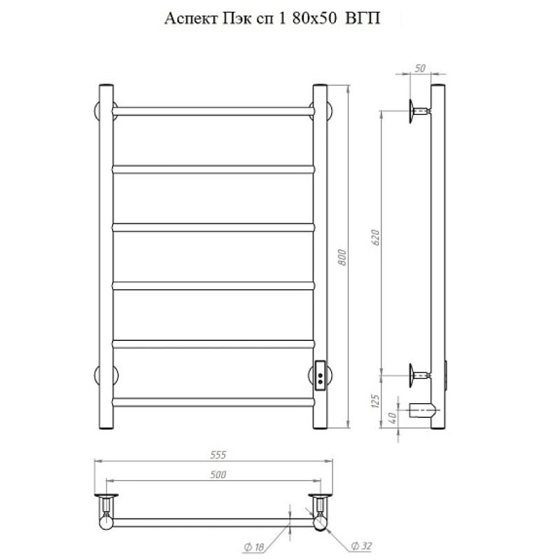 Полотенцесушитель Аспект Пэк сп 1 80х50 черный ВГП. Коллекция: Аспект Пэк сп 1 серия. Тип: электрический. Форма: лесенка. Мощность (Вт): не более 100Вт. Количество перекладин: 6. Материал: сталь. Подключение: скрытое электрическое соединение/электропровод с вилкой. Дополнительная информация: выключатель с таймером на 2, 4 и 6 часов работы и терморегулятором встроен в коллектор полотенцесушителя.