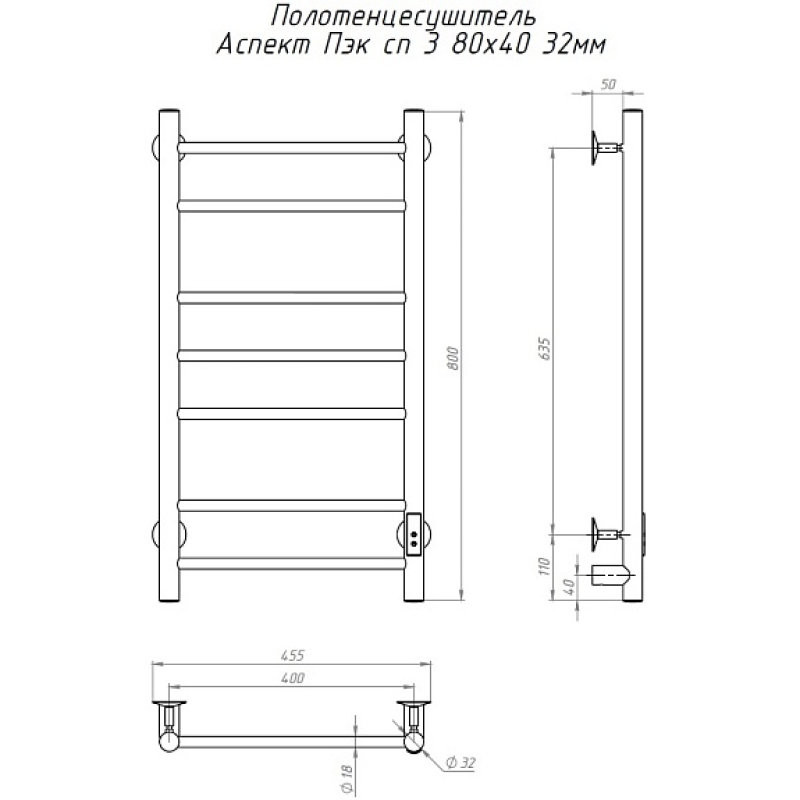 Полотенцесушитель Аспект Пэк сп 3 80х40 32 мм. Коллекция: Аспект Пэк сп серия 3. Тип: электрический. Форма: лесенка. Мощность (Вт): не более 100Вт. Количество перекладин: 7. Материал: нержавеющая сталь AISI 201. Подключение: скрытое электрическое соединение/электропровод с вилкой.