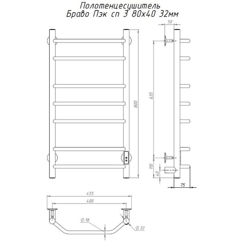 Полотенцесушитель Браво Пэк сп 3 80х40 32 мм. Коллекция: Браво Пэк сп серия 3. Тип: электрический. Форма: лесенка. Мощность (Вт): не более 100Вт. Количество перекладин: 7. Материал: нержавеющая сталь AISI 201. Подключение: скрытое электрическое соединение/электропровод с вилкой.
