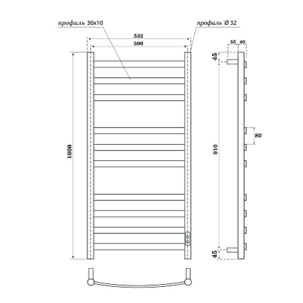 Полотенцесушитель - 1 шт, кронштейны для крепления к стене - 3 шт, сетевой кабель - 1 шт, комплект скрытого подключения - 1 шт, паспорт/гарантийный талон - 1 шт