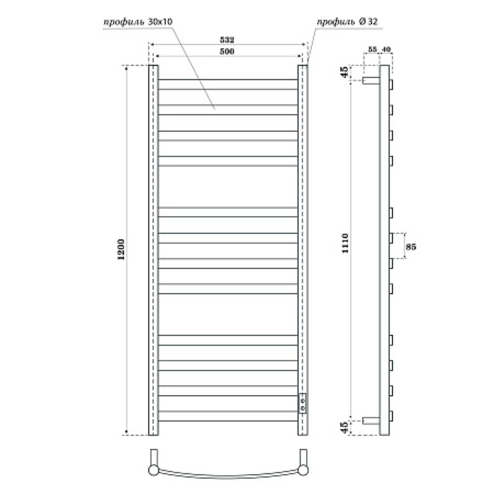 Полотенцесушитель - 1 шт, кронштейны для крепления к стене - 3 шт, сетевой кабель - 1 шт, комплект скрытого подключения - 1 шт, паспорт/гарантийный талон - 1 шт