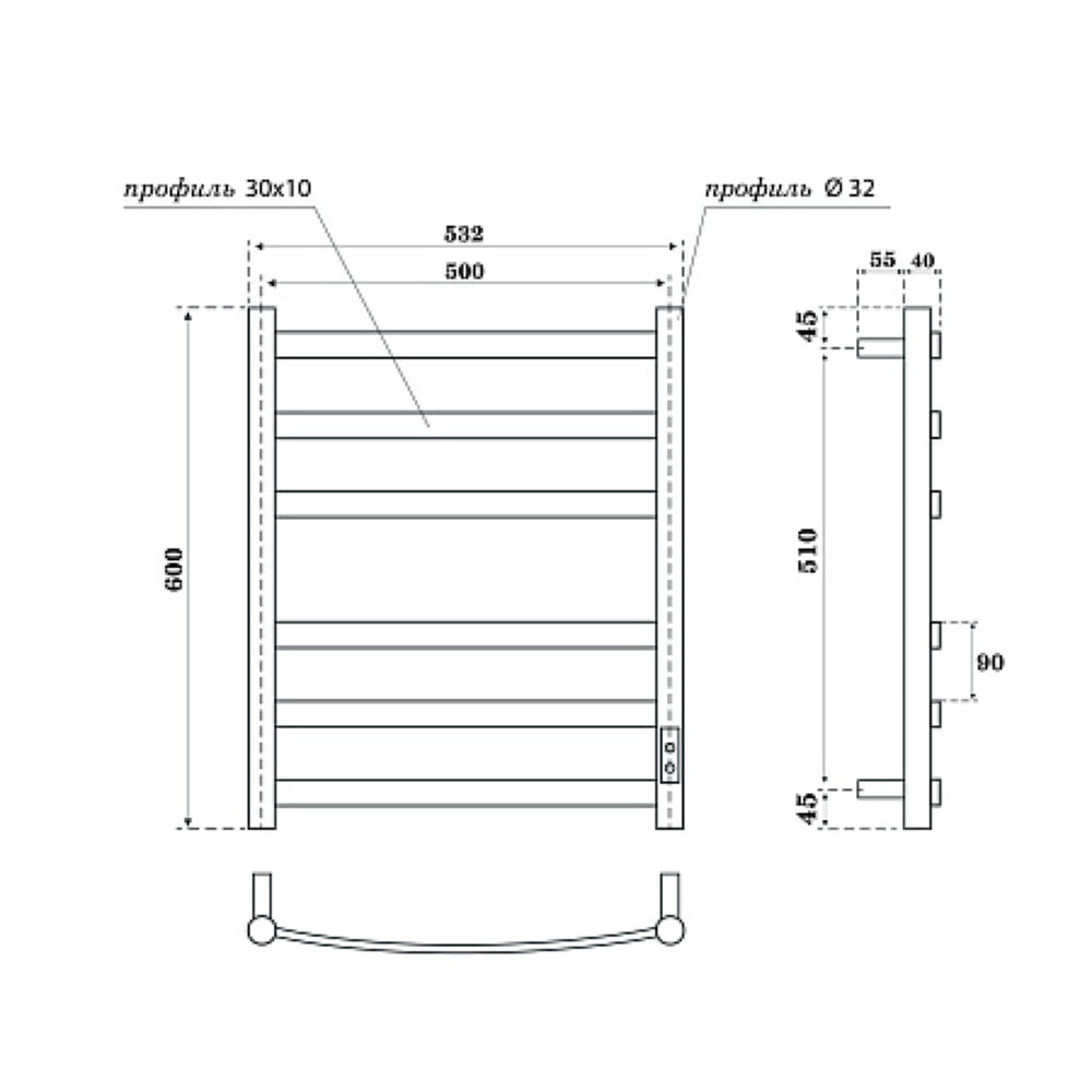 Полотенцесушитель - 1 шт, кронштейны для крепления к стене - 3 шт, сетевой кабель - 1 шт, комплект скрытого подключения - 1 шт, паспорт/гарантийный талон - 1 шт