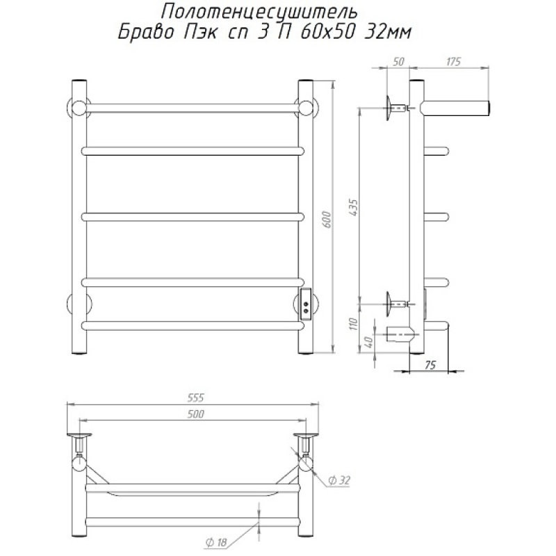 Полотенцесушитель Браво Пэк сп 3 П 60х50 32 мм. Коллекция: Браво Пэк сп серия 3. Тип: электрический. Форма: лесенка. Мощность (Вт): не более 100Вт. Количество перекладин: 4. Материал: нержавеющая сталь AISI 201. Подключение: скрытое электрическое соединение/электропровод с вилкой.