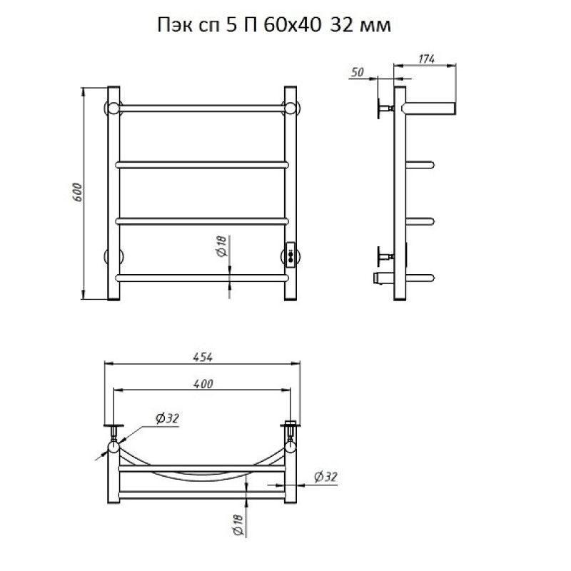 Полотенцесушитель Пэк сп 5 П 60х40 32 мм. Коллекция: ПЭК сп 5. Тип: электрический. Форма: лесенка. Мощность (Вт): не более 100Вт. Количество перекладин: 3. Материал: нержавеющая сталь AISI 201. Подключение: скрытое электрическое соединение/электропровод с вилкой.