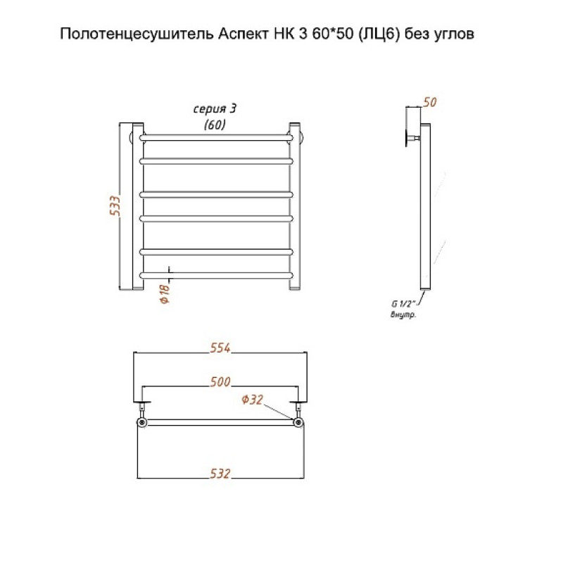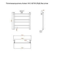 Полотенцесушитель Аспект НК 3 60*50 (ЛЦ6) без углов. Коллекция: Аспект серия 3. Тип: водяной. Форма: лесенка. Межосевое расстояние (см): 50. Группировка перекладин: 2+2+2. Материал: нержавеющая сталь AISI 304. Подключение: к системе горячего водоснабжения; к системе центрального отопления.