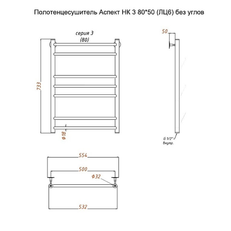 Полотенцесушитель Аспект НК 3 80*50 (ЛЦ6) без углов. Коллекция: Аспект серия 3. Тип: водяной. Форма: лесенка. Межосевое расстояние (см): 50. Группировка перекладин: 2+3+2. Материал: нержавеющая сталь AISI 304. Подключение: к системе горячего водоснабжения; к системе центрального отопления.