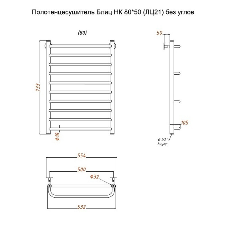 Полотенцесушитель Блиц НК 80*50 (ЛЦ21) без углов. Коллекция: Блиц. Тип: водяной. Форма: лесенка. Межосевое расстояние (см): 50. Группировка перекладин: 10+4. Материал: нержавеющая сталь AISI 304. Подключение: к системе горячего водоснабжения; к системе центрального отопления.