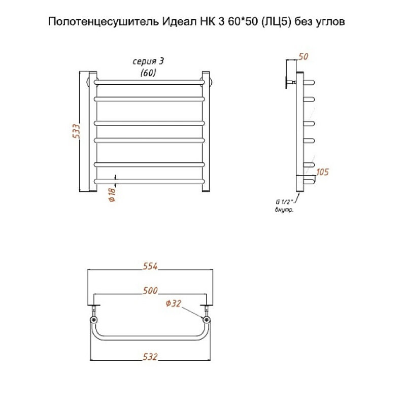 Полотенцесушитель Идеал НК 3 60*50 (ЛЦ5) без углов. Коллекция: Идеал серия 3. Тип: водяной. Форма: лесенка. Межосевое расстояние (см): 50. Группировка перекладин: 2+2+2. Материал: нержавеющая сталь AISI 304. Подключение: к системе горячего водоснабжения; к системе центрального отопления.