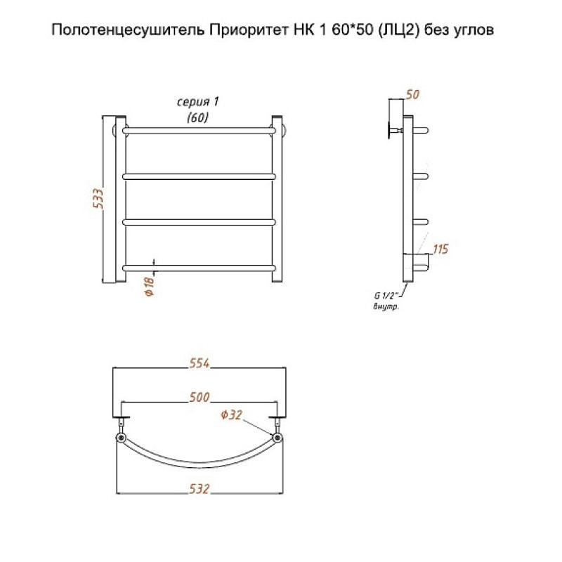 Полотенцесушитель Приоритет НК 1 60*50 (ЛЦ2) без углов. Коллекция: Приоритет серия 1. Тип: водяной. Форма: лесенка. Межосевое расстояние (см): 50. Группировка перекладин: равно отдалённые. Материал: нержавеющая сталь AISI 304. Подключение: к системе горячего водоснабжения; к системе центрального отопления.