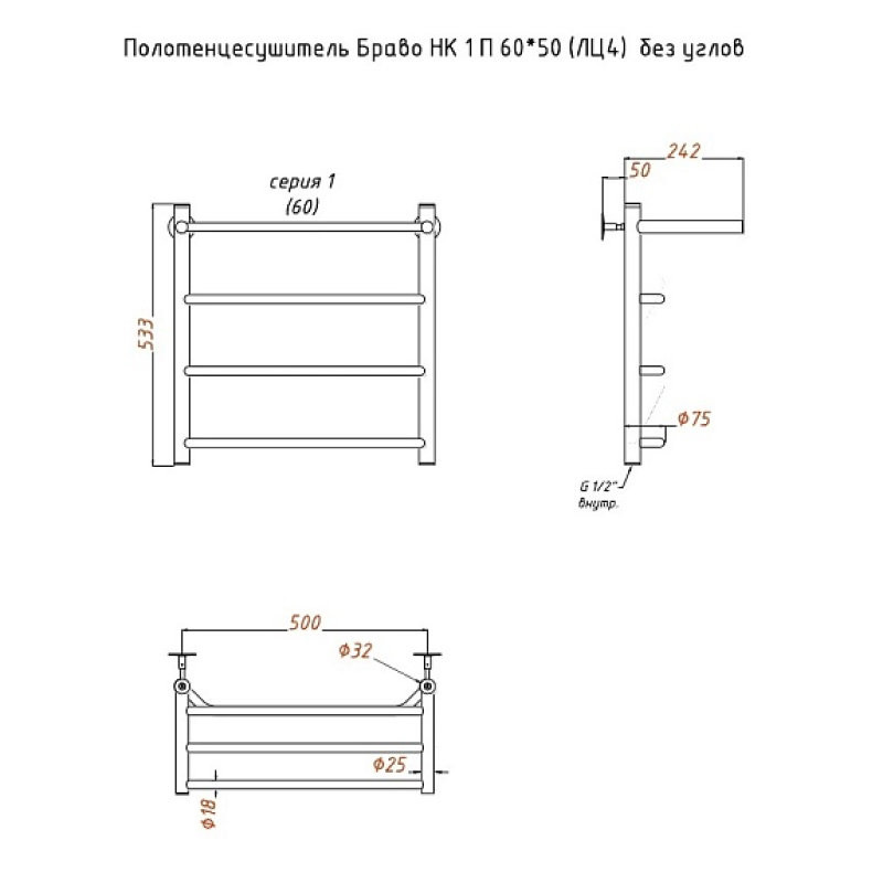 Полотенцесушитель Браво НК 1 П 60*50 (ЛЦ4) без углов. Коллекция: Браво серия 1. Тип: водяной. Форма: лесенка. Межосевое расстояние (см): 50. Группировка перекладин: равно отдалённые. Материал: нержавеющая сталь AISI 304. Подключение: к системе горячего водоснабжения; к системе центрального отопления.