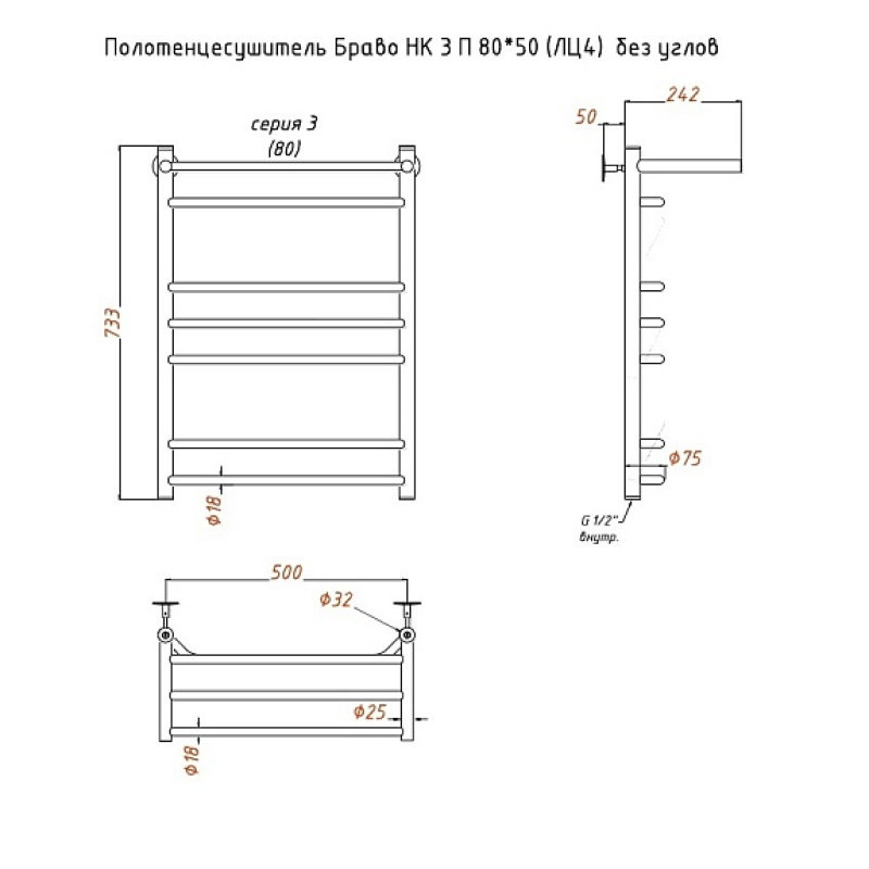 Полотенцесушитель Браво НК 3 П 80*50 (ЛЦ4) без углов. Коллекция: Браво серия 3. Тип: водяной. Форма: лесенка. Межосевое расстояние (см): 50. Группировка перекладин: 2+3+1. Материал: нержавеющая сталь AISI 304. Подключение: к системе горячего водоснабжения; к системе центрального отопления.