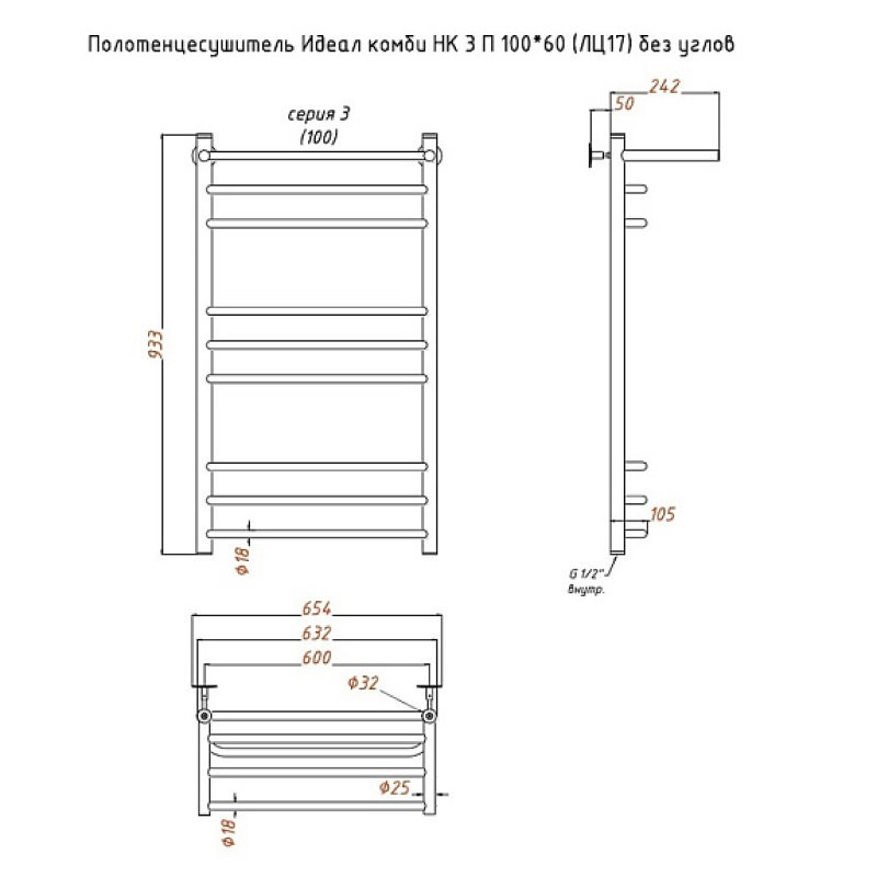 Полотенцесушитель Идеал комби НК 3 П 100*60 (ЛЦ17) без углов. Коллекция: Идеал комби. Тип: водяной. Форма: лесенка. Межосевое расстояние (см): 60. Группировка перекладин: 3+3+2. Материал: нержавеющая сталь AISI 304. Подключение: к системе горячего водоснабжения; к системе центрального отопления.