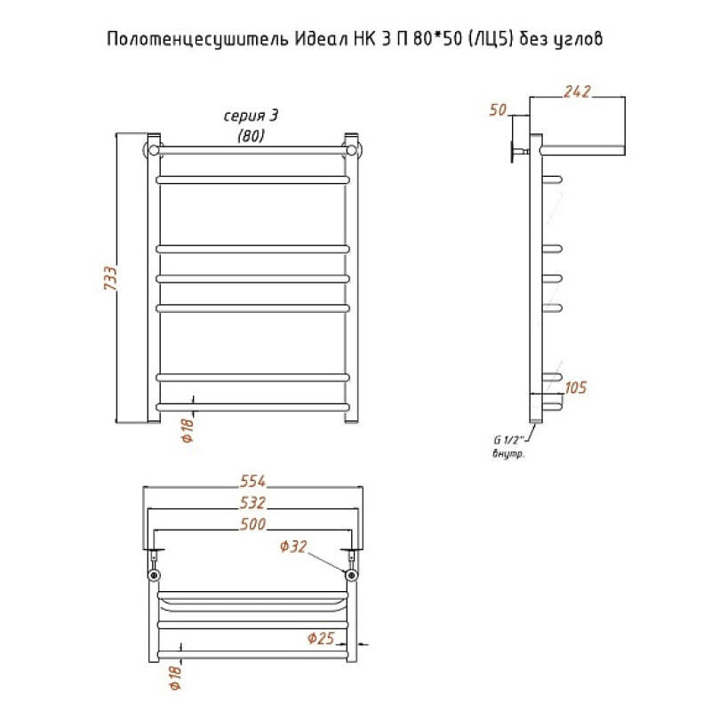 Полотенцесушитель Идеал НК 3 П 80*50 (ЛЦ5) без углов. Коллекция: Идеал серия 3. Тип: водяной. Форма: лесенка. Межосевое расстояние (см): 50. Группировка перекладин: 2+3+1. Материал: нержавеющая сталь AISI 304. Подключение: к системе горячего водоснабжения; к системе центрального отопления.