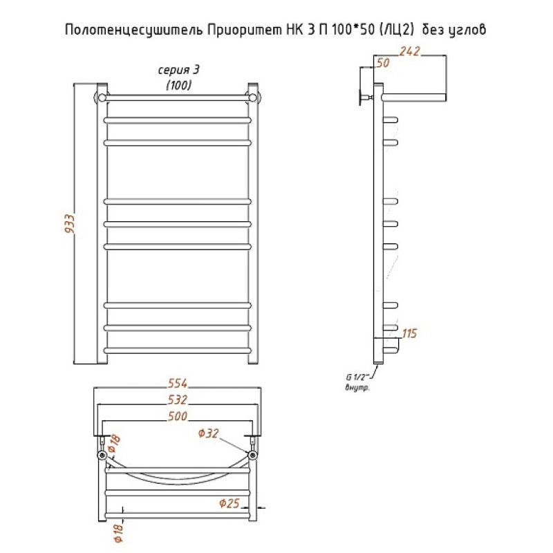 Полотенцесушитель Приоритет НК 3 П 100*50 (ЛЦ2) без углов. Коллекция: Приоритет серия 3. Тип: водяной. Форма: лесенка. Межосевое расстояние (см): 50. Группировка перекладин: 3+3+2. Материал: нержавеющая сталь AISI 304. Подключение: к системе горячего водоснабжения; к системе центрального отопления.