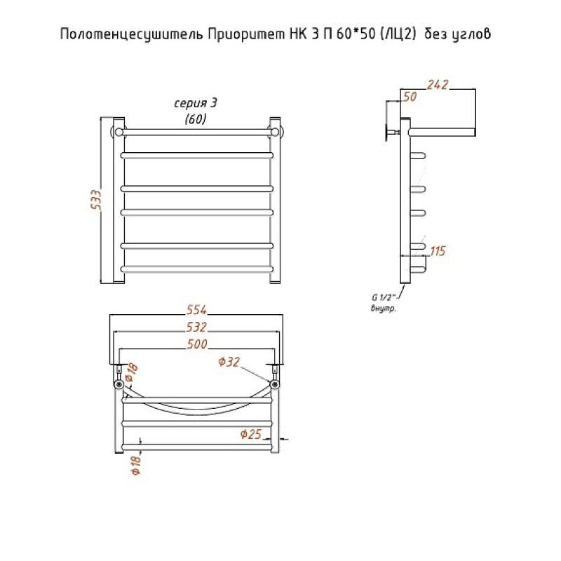 Полотенцесушитель Приоритет НК 3 П 60*50 (ЛЦ2) без углов. Коллекция: Приоритет серия 3. Тип: водяной. Форма: лесенка. Межосевое расстояние (см): 50. Группировка перекладин: 3+2. Материал: нержавеющая сталь AISI 304. Подключение: к системе горячего водоснабжения; к системе центрального отопления.