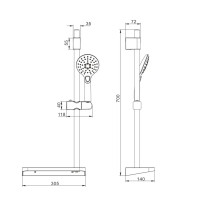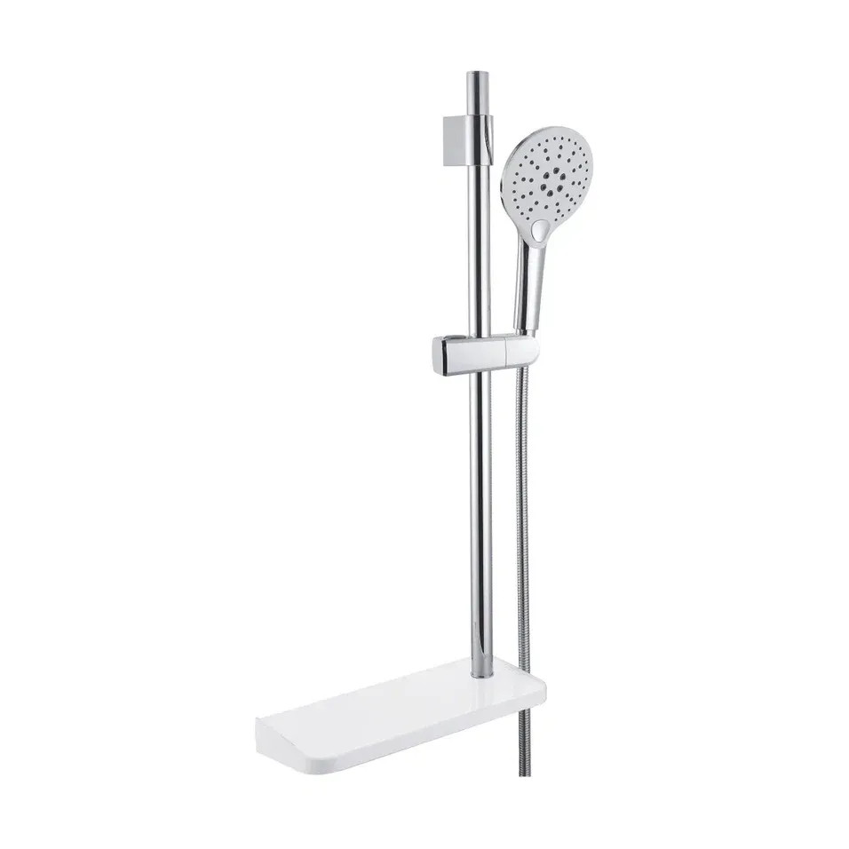 Комплектация: душевая штанга, полочка, душевая лейка, держатель лейки, шланг;