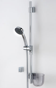 Душевой комплект состоит из штанги с произвольным расстоянием между крепёжными отверстиями, душевой лейки с эко-кнопкой, держателя душевой лейки, шланга, вместительной мыльницы и крючка
