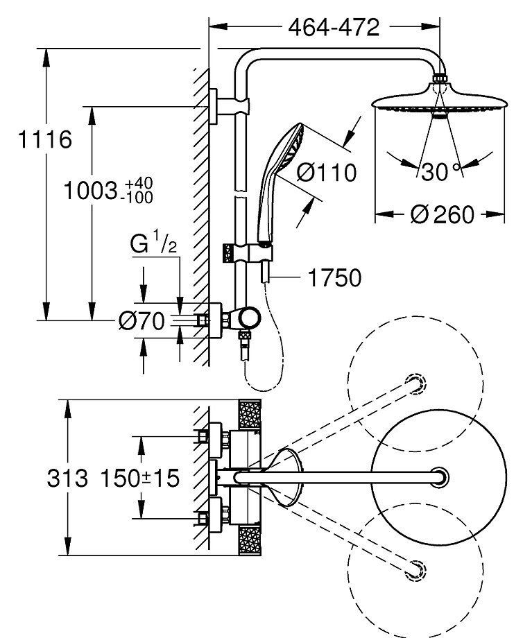 27615002 Euphoria 260 Душевая система с термостатом для душа, 9.5 л/мин, хром (замена 27615001)