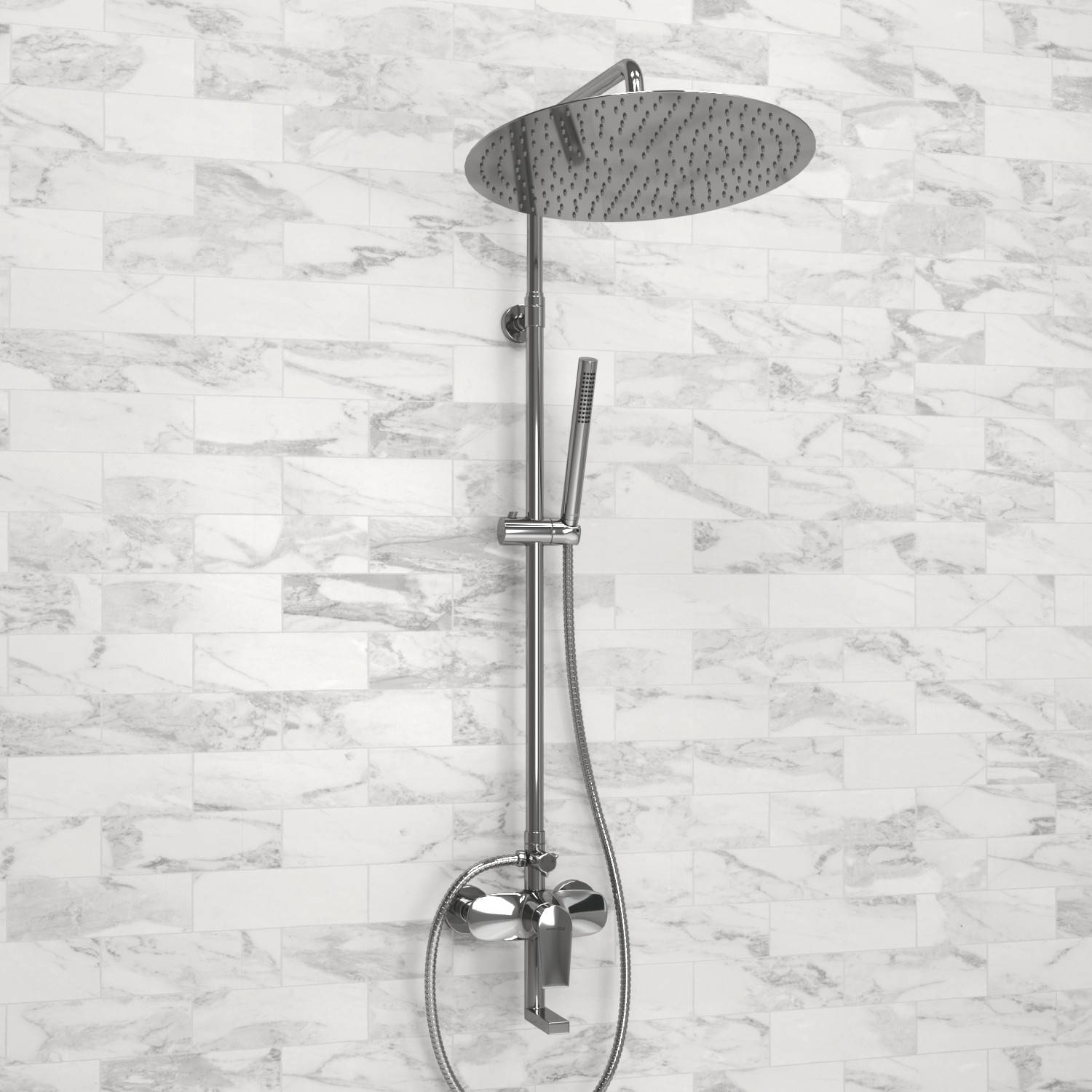 Рекомендуем до начала монтажа душевого комплекта проверить, комфортна ли вам будет высота, на которой будет располагаться верхняя душевая насадка. Для этого выдвиньте стойку на максимум и приложите к стене, ориентируясь на высоту подключения смесителя к воде.