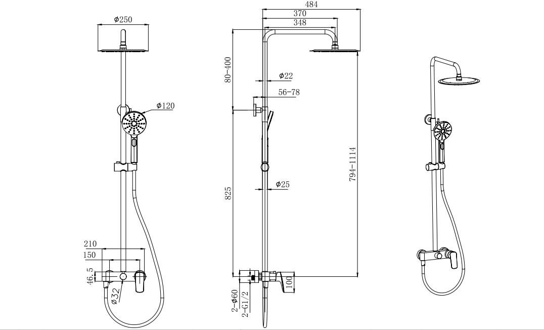 AQ2060MB ВЕГА душевая система (смеситель для душа) 3jet 250мм, матовый черный