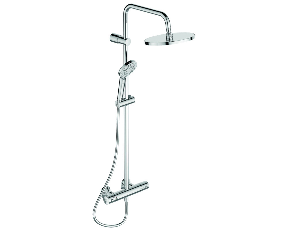 IDEALRAIN ECO EVO Душевая система в комплекте с настенным термостатическим смесителем для душа с двумя выходами Ceratherm 100 A4639AA; 3-функциональная душевая лейка EVO ROUND B2231AA Ø110 мм, ограничение потока 8 л/мин, верхний душ Ø250 мм (пластик), ограничение потока 12 л/мин, душевая труба Ø25 мм для верхнего душа, ручное переключение, пластиковый держатель, металлические крепления к стене, шланг для душа IdealFlex 1750 мм