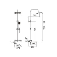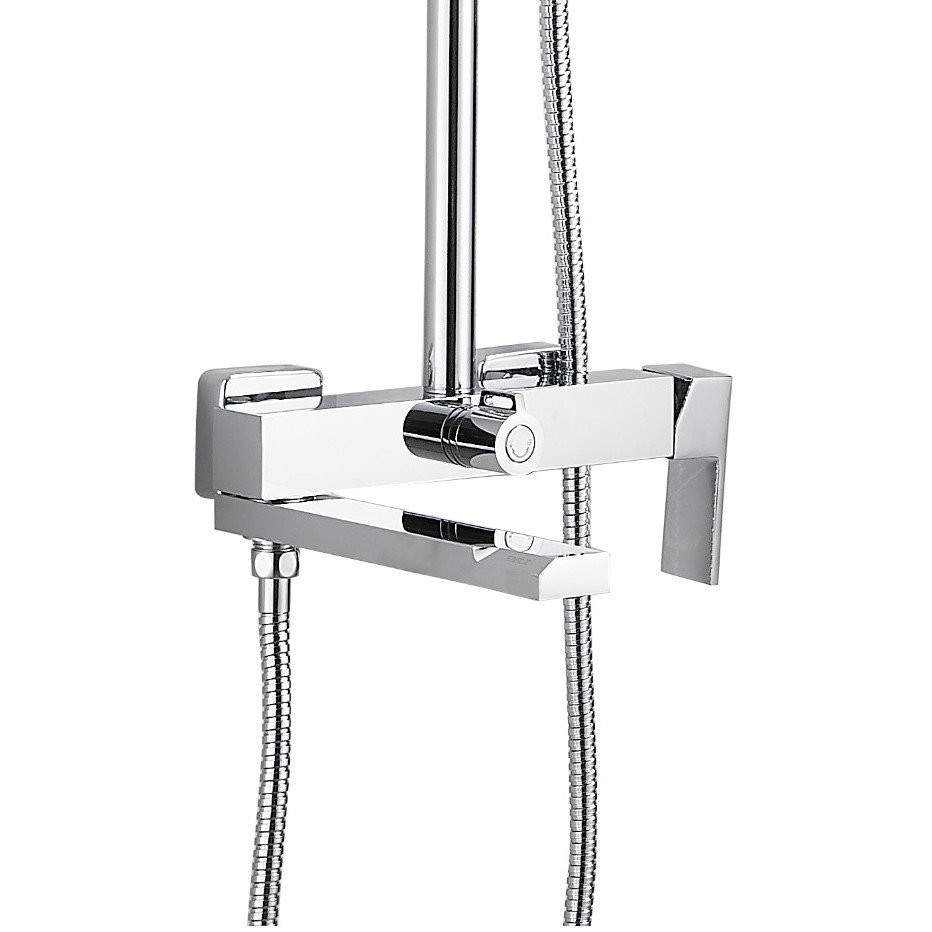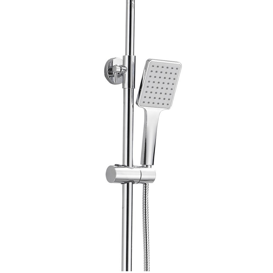 Комплектация: смеситель, верхний душ, душевая лейка, держатель душевой лейки, шланг, стойка;