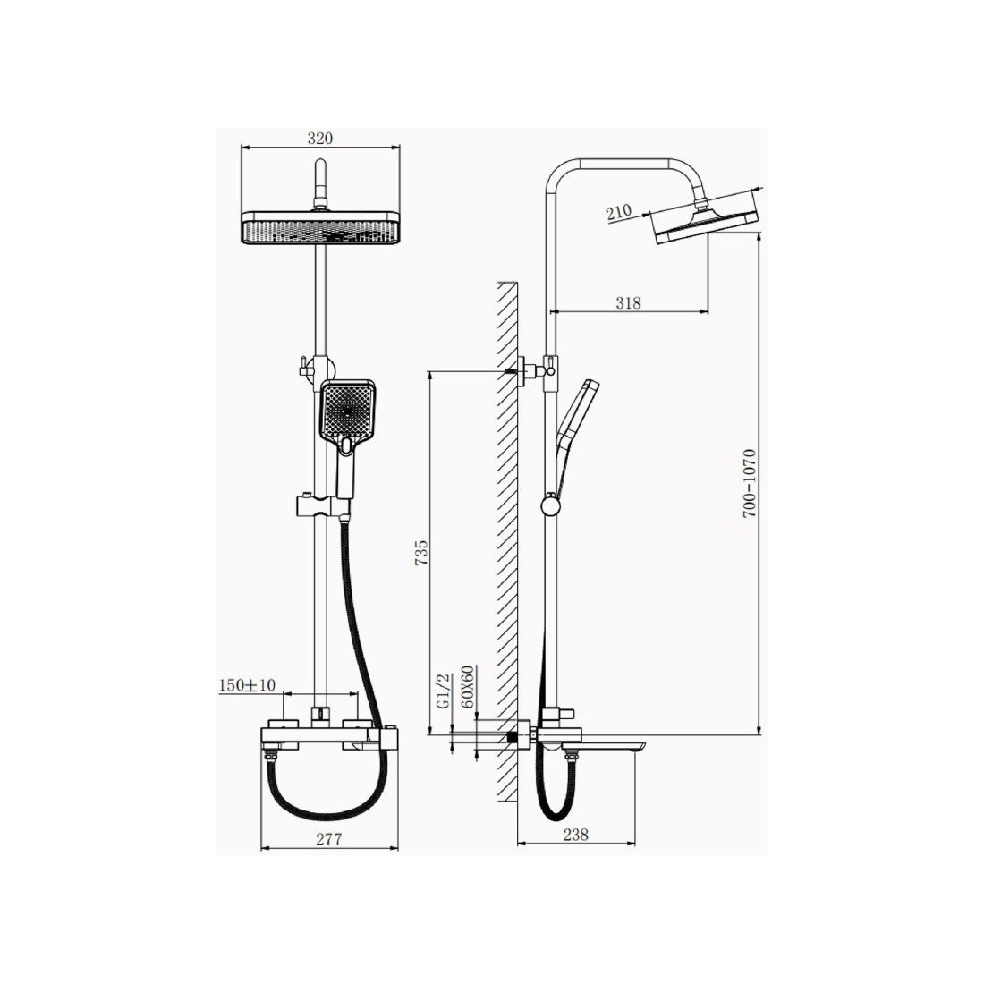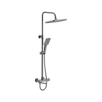Комплектация: смеситель, верхний душ, душевая лейка, держатель душевой лейки, шланг, стойка;