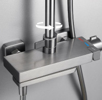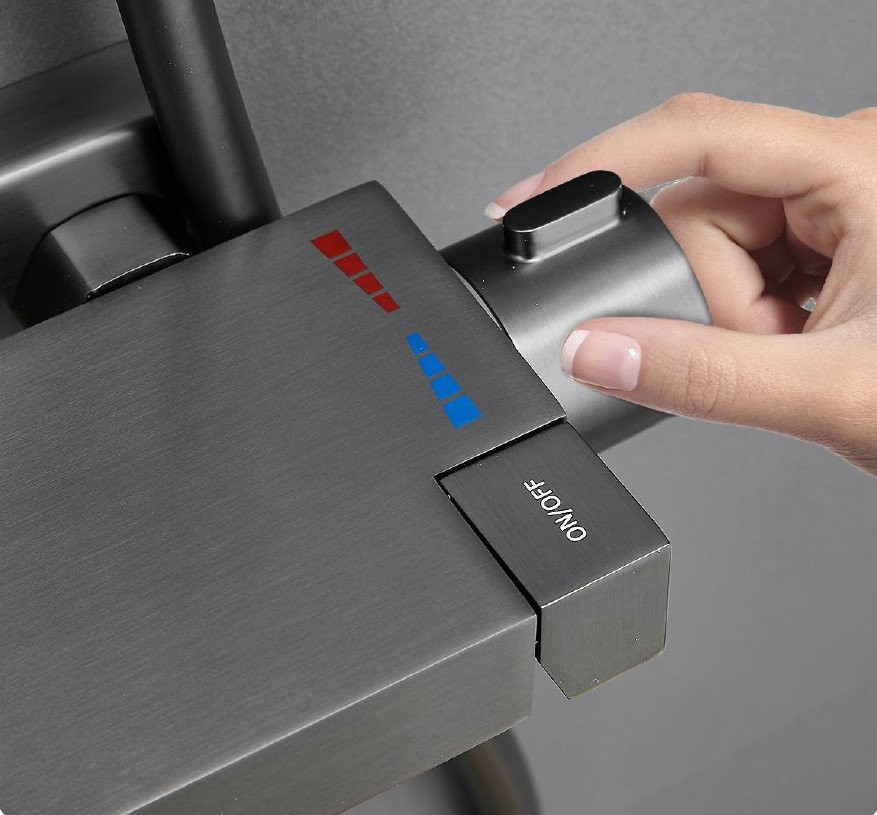 Одной из главных особенностей этой душевой системы является инновационный поворотный контроль температуры. Среднее положение ручки фиксирует идеальную температуру воды на уровне 40 градусов, что позволяет наслаждаться душем без необходимости дополнительных настроек.