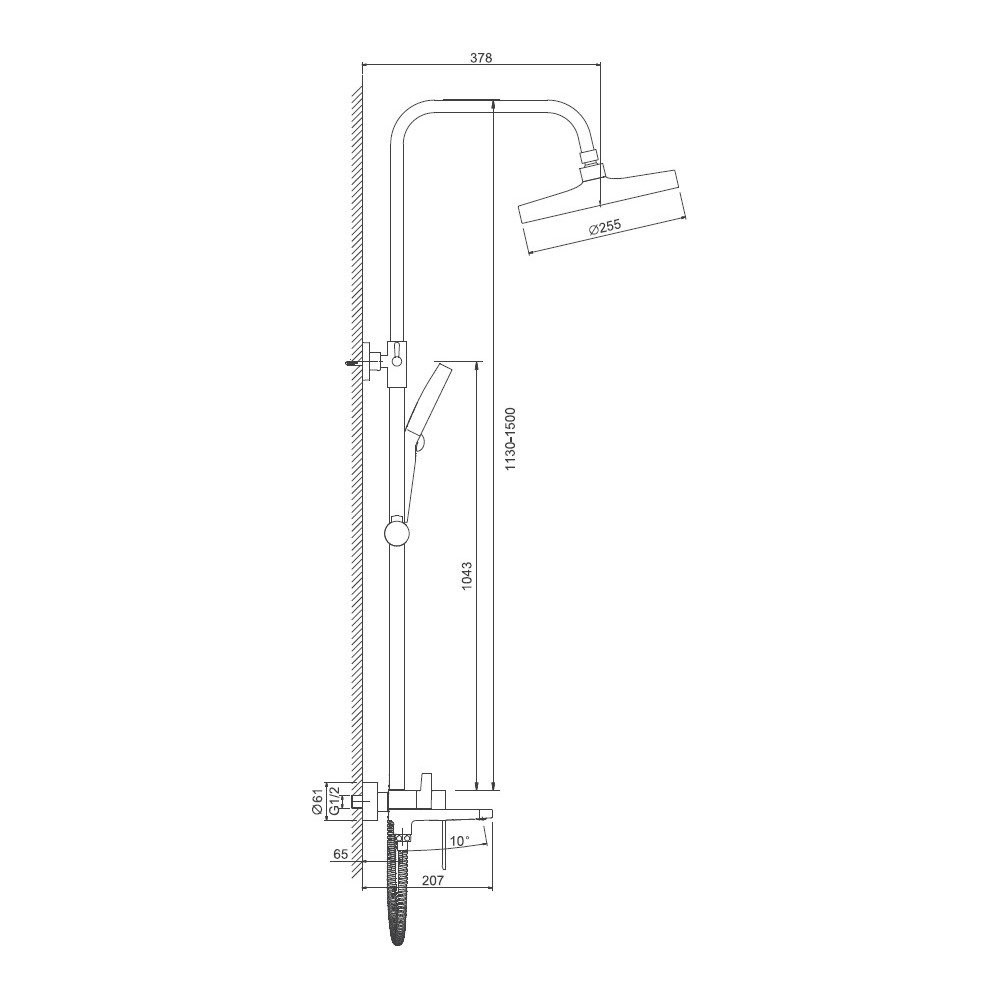 Излив душевой системы оснащён аэратором и в сложенном состоянии служит переключателем потока воды, что добавляет удобства в использовании. Верхний душ диаметром 255 мм изготовлен из ABS-пластика и оснащён силиконовыми форсунками, которые легко очищаются от известкового налёта. Благодаря шарниру верхний душ можно регулировать по наклону вдоль всей оси, а его высота настраивается с помощью телескопической конструкции штанги.