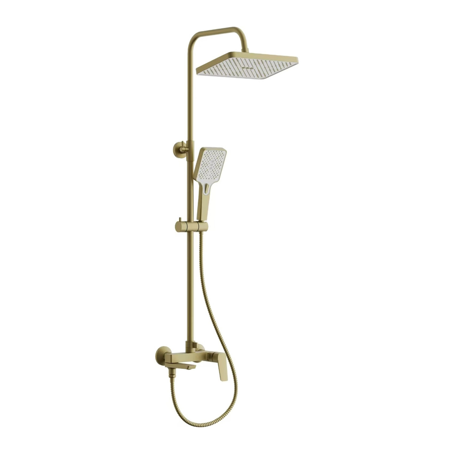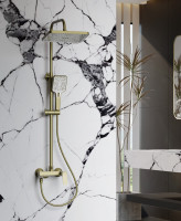 Излив душевой системы оснащён аэратором и в сложенном состоянии служит переключателем потока воды, что добавляет удобства в использовании. Верхний душ размером 305х205 мм изготовлен из ABS-пластика и оснащён силиконовыми форсунками, которые легко очищаются от известкового налёта. Благодаря шарниру верхний душ можно регулировать по наклону вдоль всей оси, а его высота настраивается с помощью телескопической конструкции штанги.