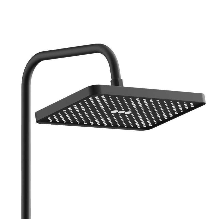 Излив душевой системы оснащён аэратором и в сложенном состоянии служит переключателем потока воды, что добавляет удобства в использовании. Верхний душ размером 305х205 мм изготовлен из ABS-пластика и оснащён силиконовыми форсунками, которые легко очищаются от известкового налёта. Благодаря шарниру верхний душ можно регулировать по наклону вдоль всей оси, а его высота настраивается с помощью телескопической конструкции штанги.