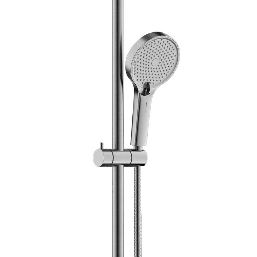 Душевая лейка (ручной душ) также изготовлена из ABS-пластика и оснащена силиконовыми форсунками. Она регулируется как по высоте, так и по наклону благодаря подвижному держателю на штанге. Душевая система комплектуется шлангом в двойной металлической оплётке длиной 150 см, что обеспечивает его прочность и долговечность.