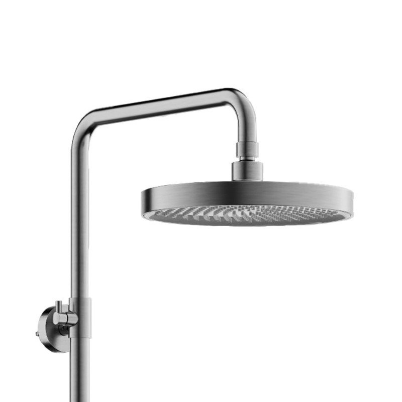 Поворотный излив душевой системы оснащён аэратором, что делает поток воды мягче и способствует экономии. Верхний душ диаметром 255 мм изготовлен из качественного ABS-пластика и оснащён силиконовыми форсунками, которые легко очищаются от известкового налёта. Благодаря шарниру верхний душ можно регулировать по наклону вдоль всей оси, а его высота настраивается с помощью телескопической конструкции штанги.