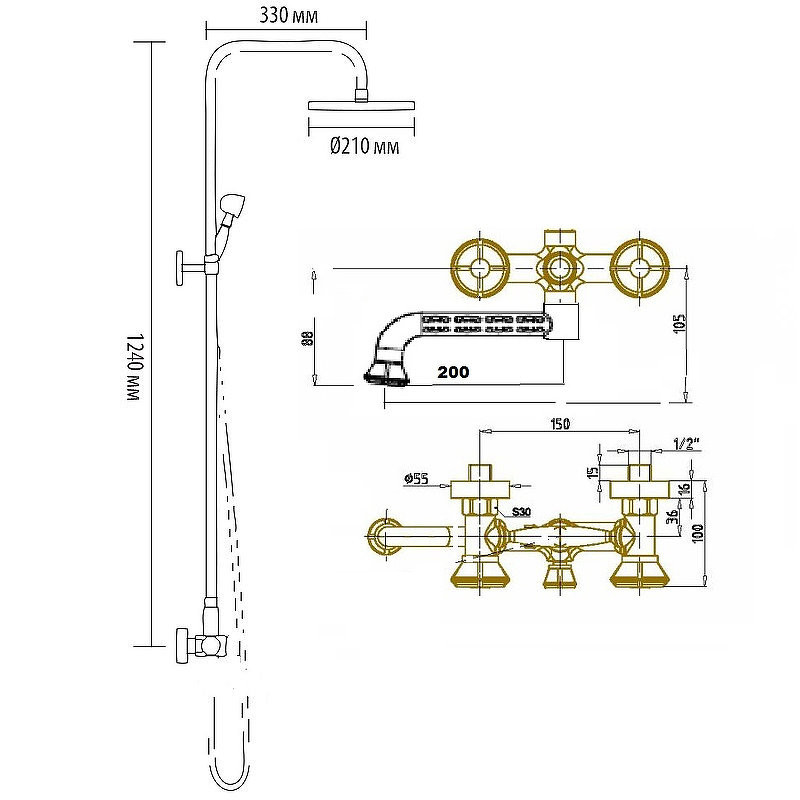 Комплектация: смеситель, верхний душ, душевая стойка, лейка, держатель лейки, шланг, эксцентрики, декоративные отражатели;