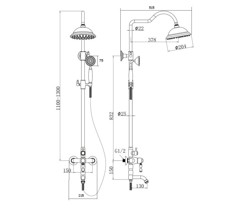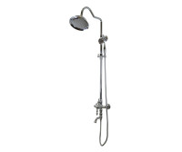 Комплектация: смеситель, верхний душ, душевая стойка, лейка, держатель лейки, шланг, эксцентрики, декоративные отражатели;