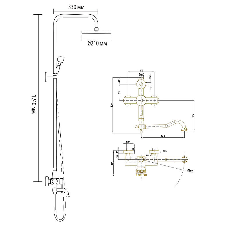 Комплектация: смеситель, верхний душ, душевая стойка, лейка, держатель лейки, шланг, эксцентрики, декоративные отражатели;