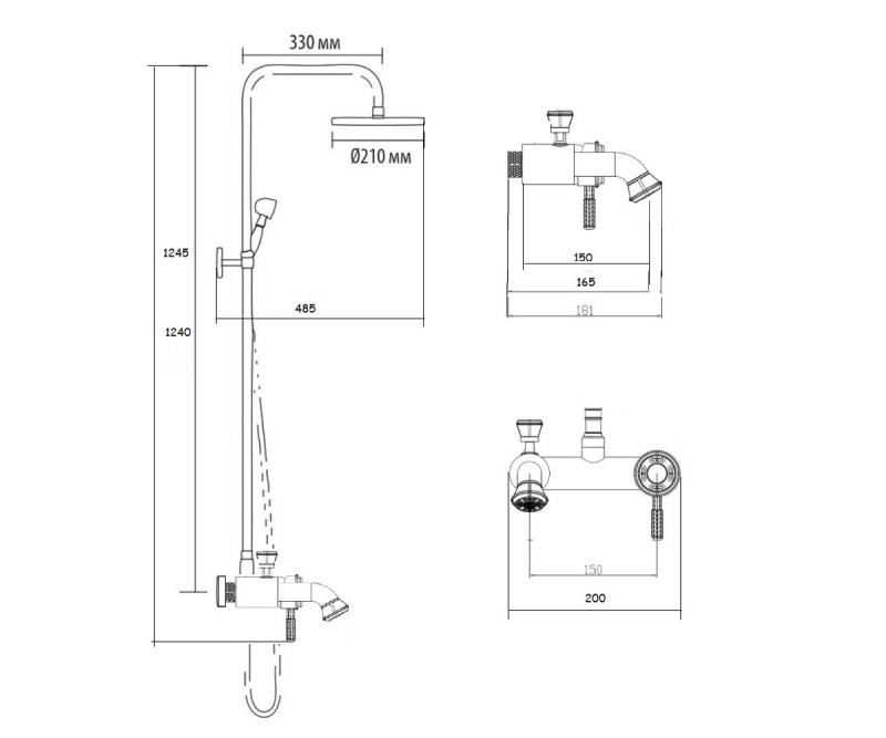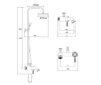 Комплектация: смеситель, верхний душ, душевая стойка, лейка, держатель лейки, шланг, эксцентрики, декоративные отражатели;