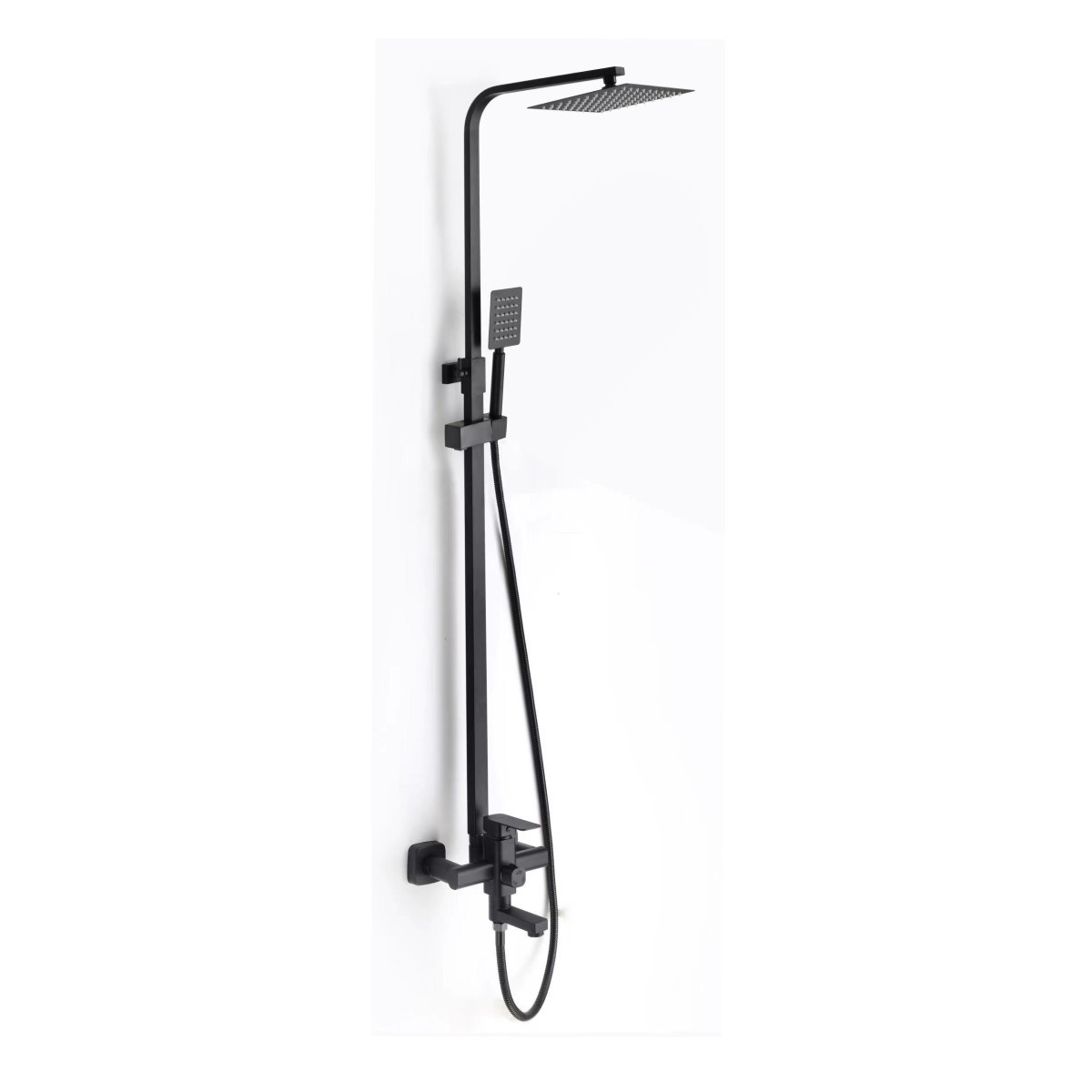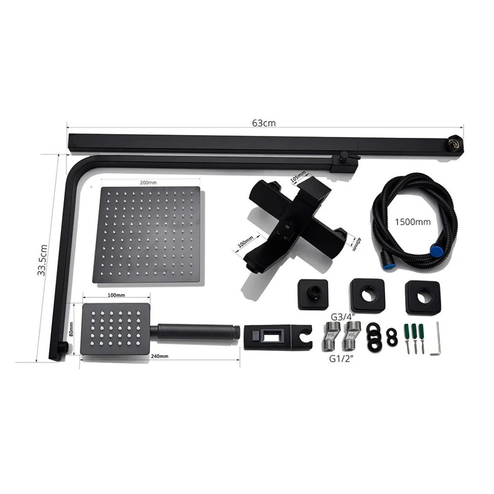 Комплектация: верхний душ, душевая штанга, держатель душевой лейки, ручной душ, смеситель, шланг, эксцентрики, декоративные чашки;