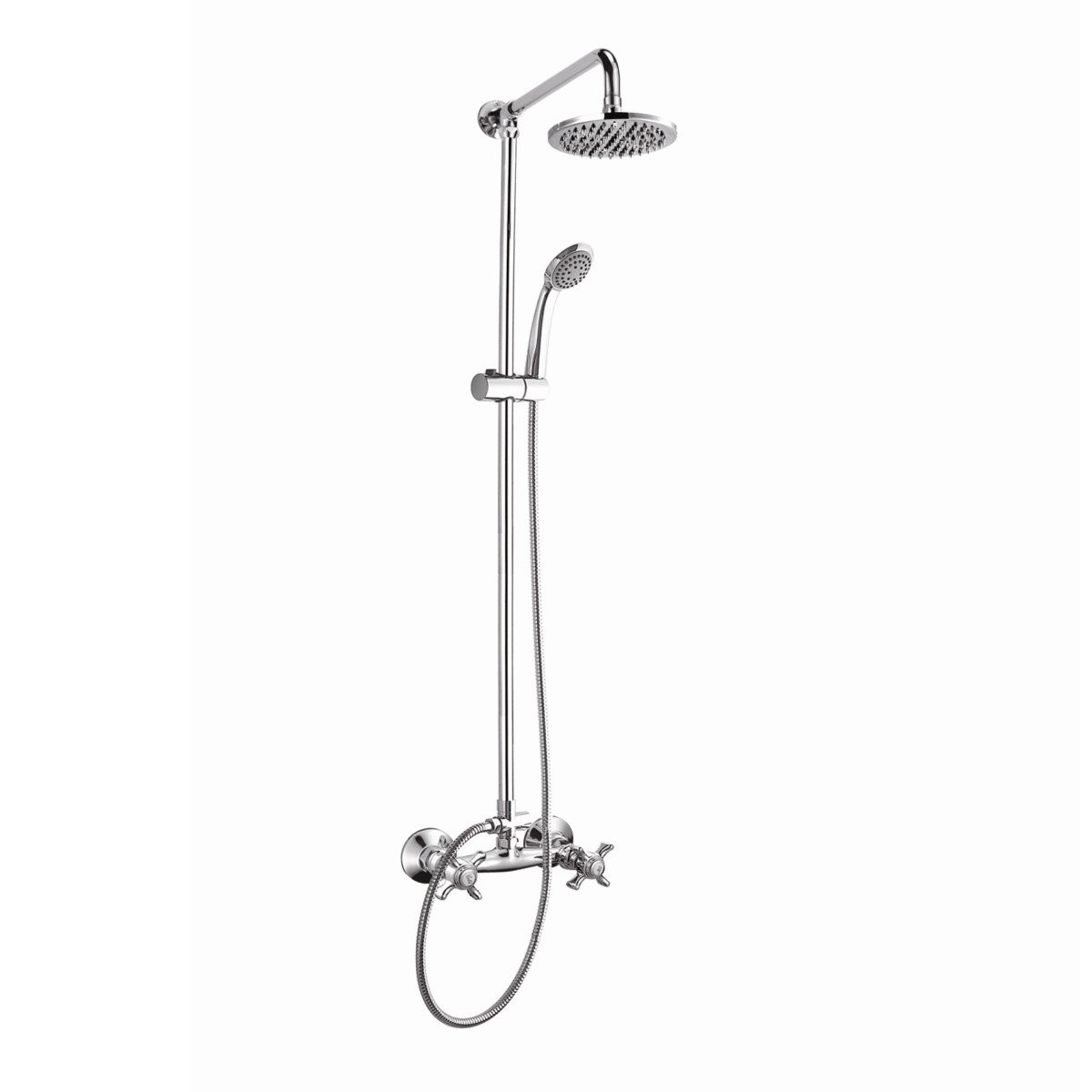 Комплектация: верхний душ, душевая штанга, держатель душевой лейки, ручной душ, смеситель, шланг, эксцентрики, декоративные чашки;
