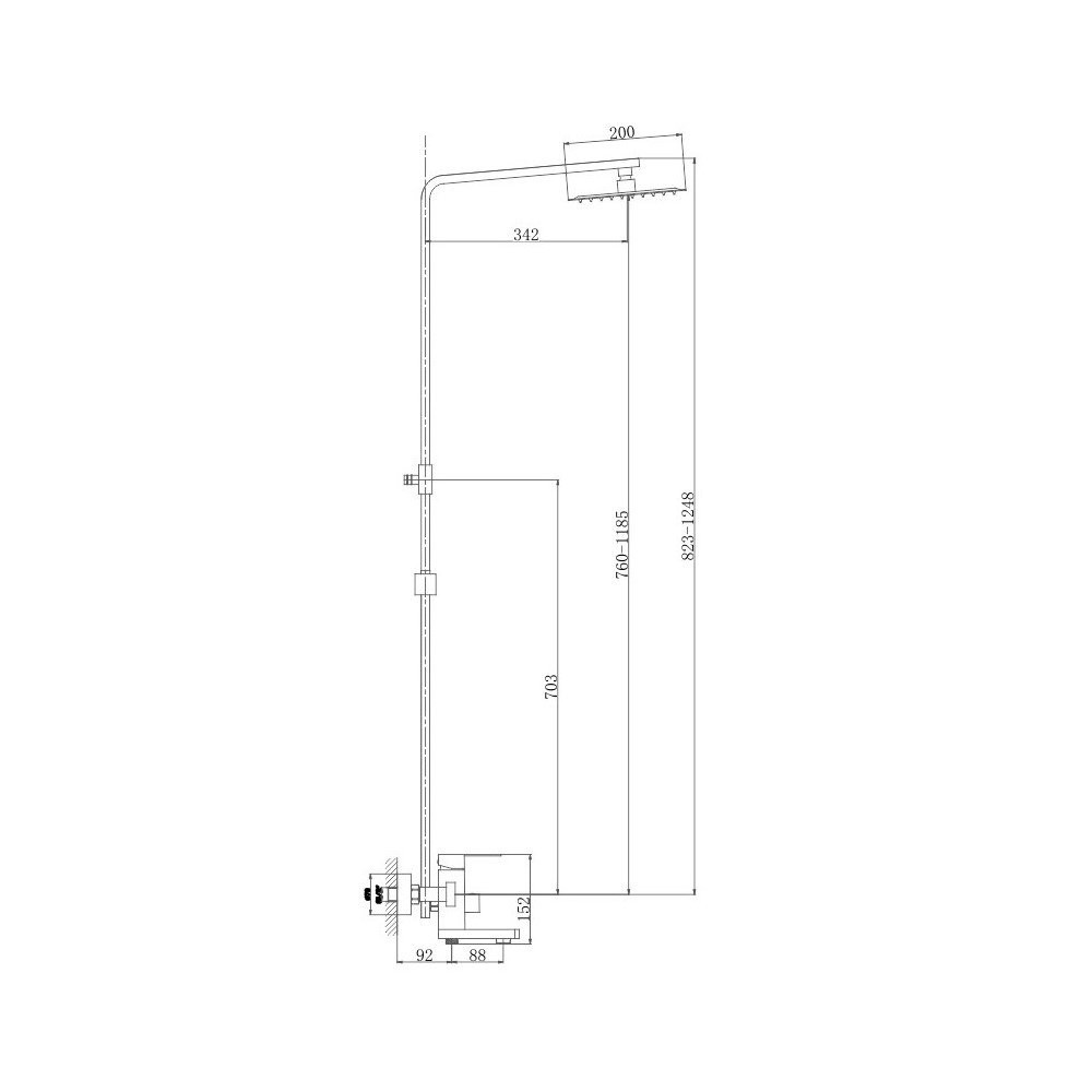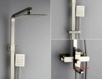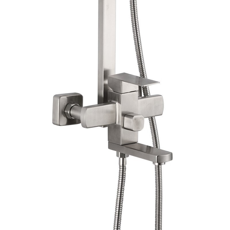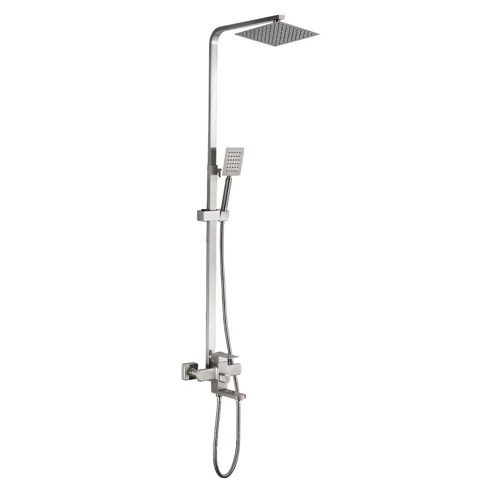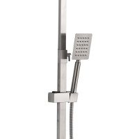 Душевая система D-Lin. Изготовлена из высококачественной нержавеющей стали. Тропический душ квадратной формы имеет оптимальный размер 20х20 см., легко очищается благодаря силиконовым форсункам. Поворотный излив для наполнения ванны. Душевая штанга регулируется по высоте от 82,3 см до 124,8 см.